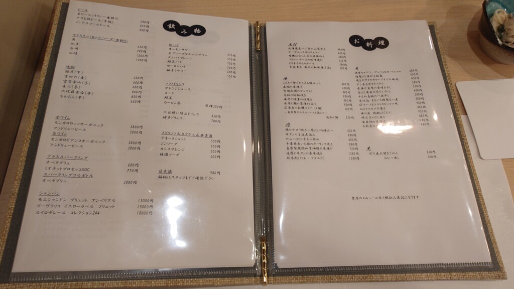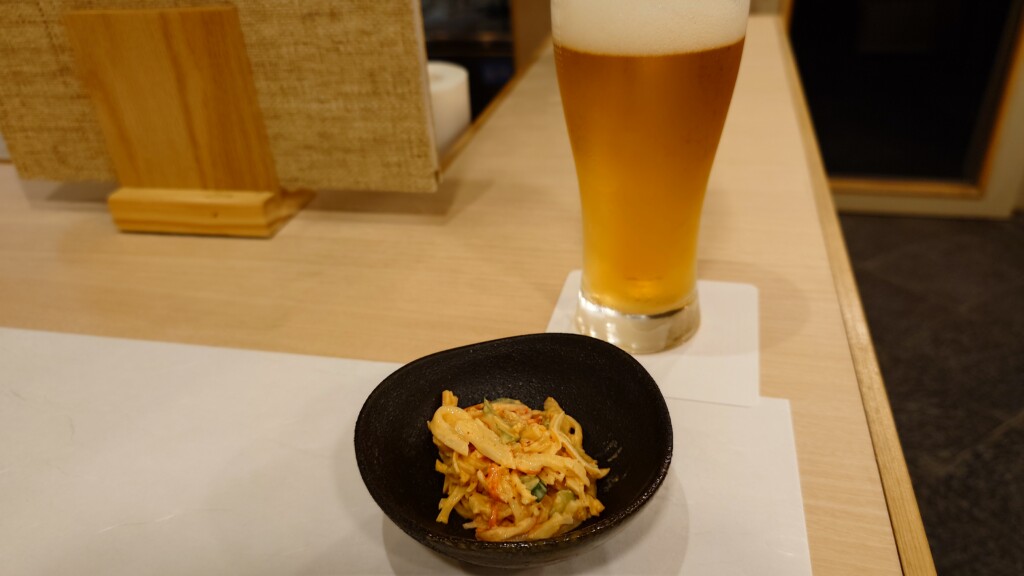 まずはビール&お通しを頂きつつ、その後の展開を考えるべくメニューを吟味