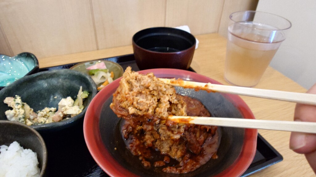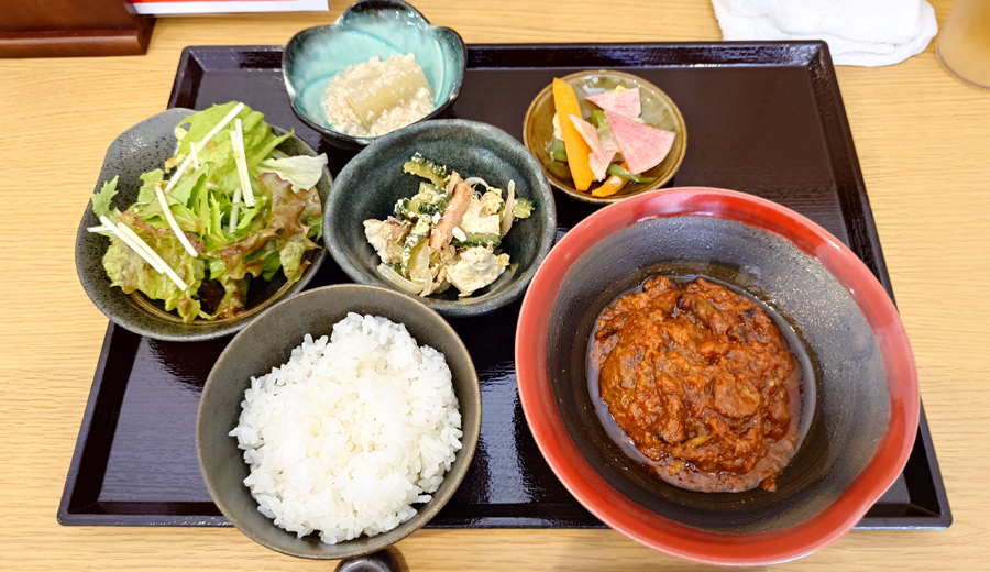 「家庭料理とおばんざいの店 まるっと」にて頂く、煮込みハンバーグ定食となります