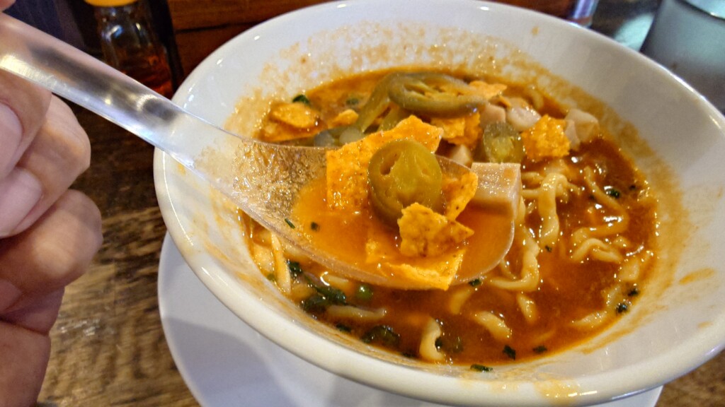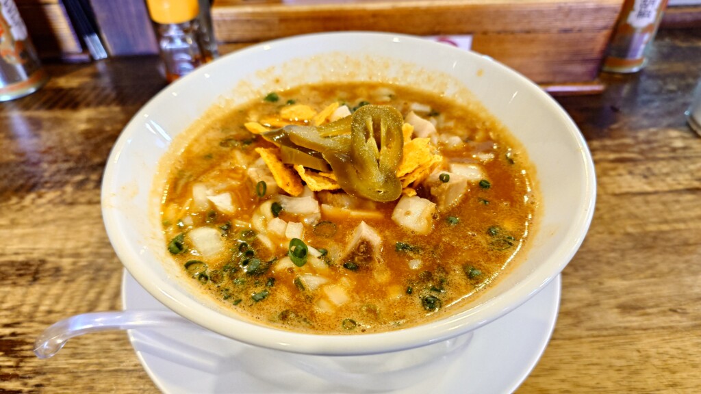 温かいスープに、濃厚な旨みと確かな辛味、そしてメキシカンが混在するこちらのラーメン
