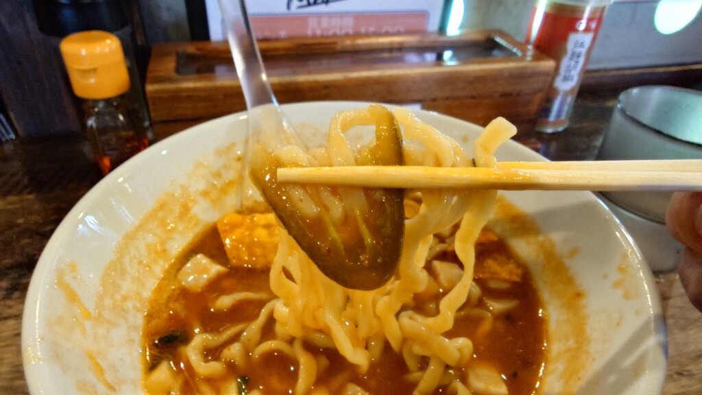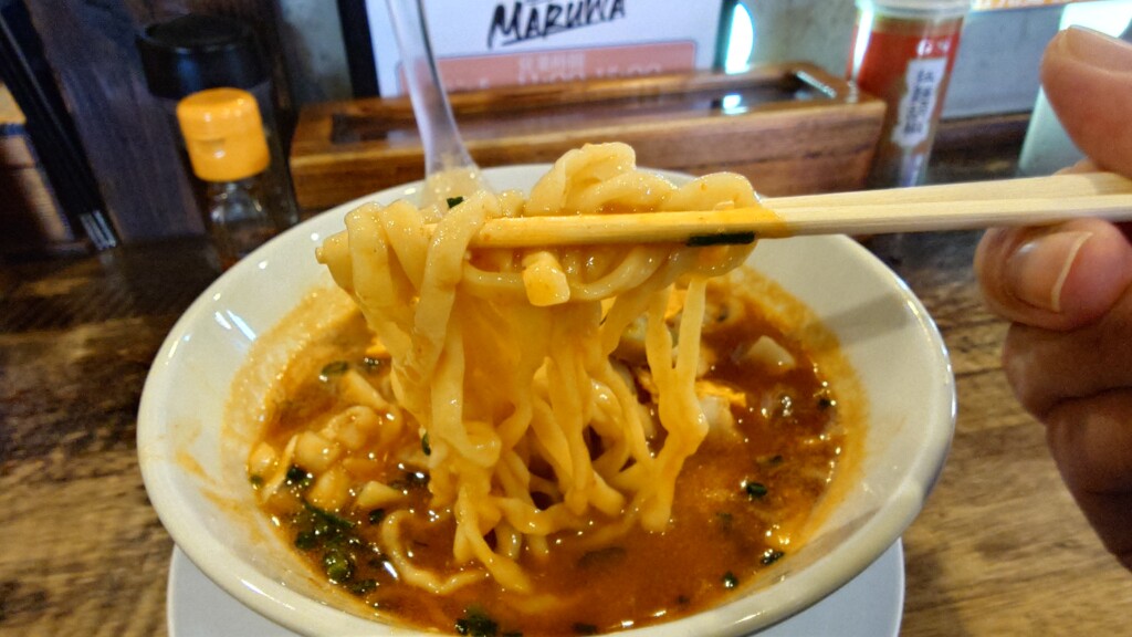 幅広な麺がしっかり持ちあげる、旨辛スープ