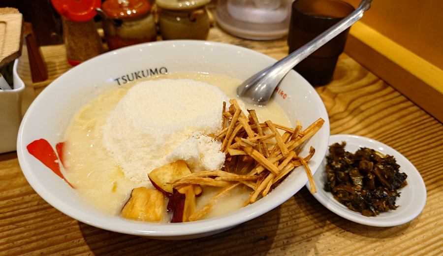 山盛りチーズに個性的な揚げ野菜もトッピング 濃厚な旨味押し寄せる白いチーズラーメン