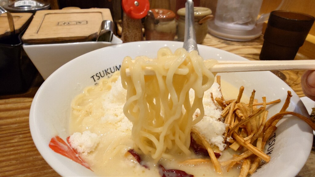 合わさる麺も、その濃厚さに負けない存在を見せる上