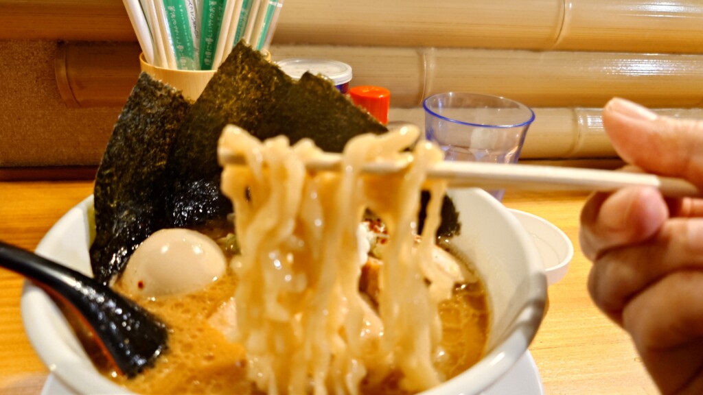 幅広の太麺が残すピロッとした独特の舌触りに、しっかりと絡まるスープの旨味