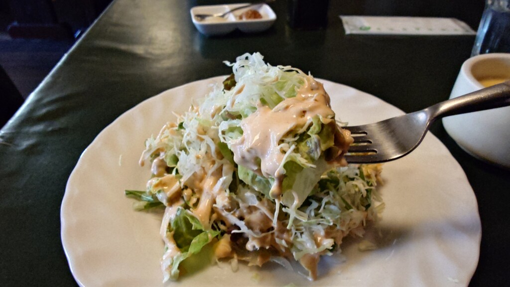 葉物野菜を中心としたサラダをサウザンドレッシングにて頂きつつ