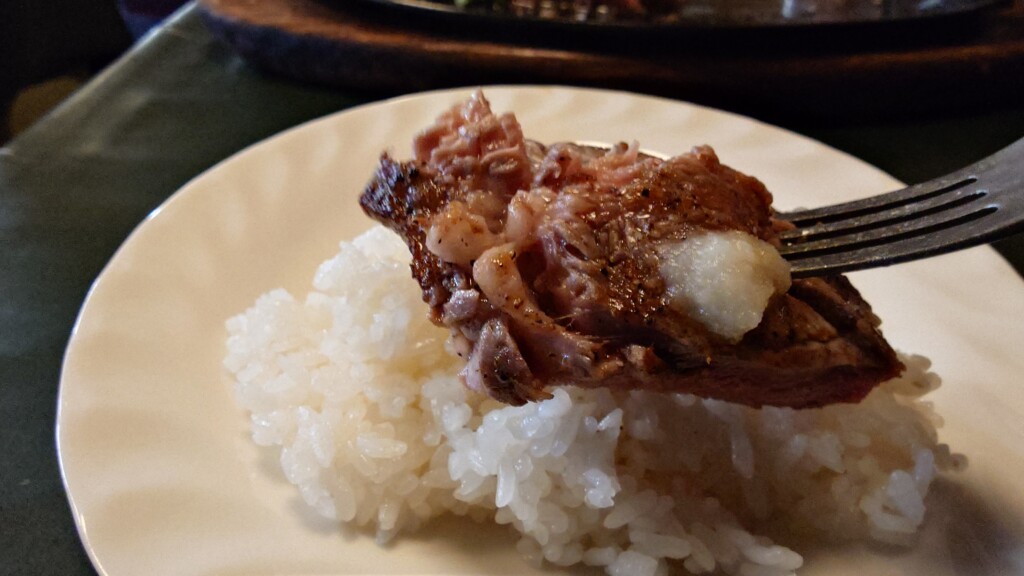 にんにく醤油との相性抜群、脂と赤身のバランス良好なテキサスのリブステーキを堪能