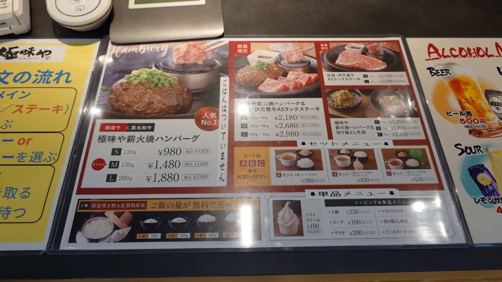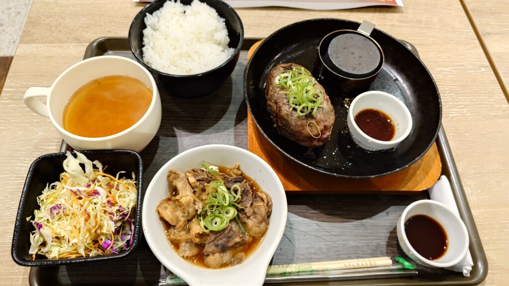 「極味や 船橋店」で頂く、極味や薪火焼きハンバーグ&切り落とし牛皿のAセットとなります