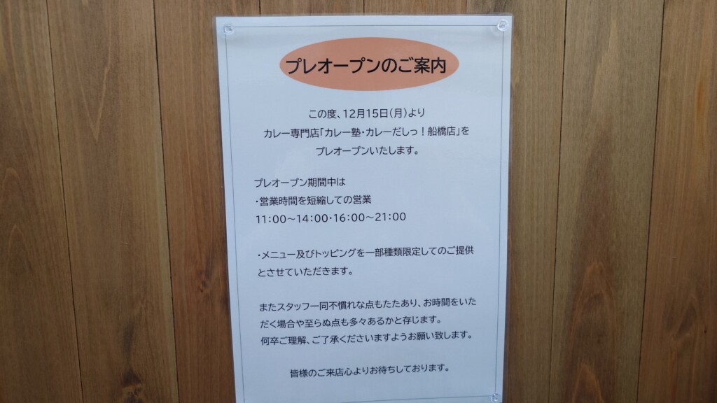 「カレーだしっ! カレー塾 船橋店」という新店になります
