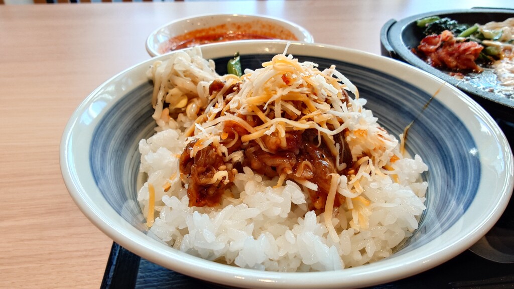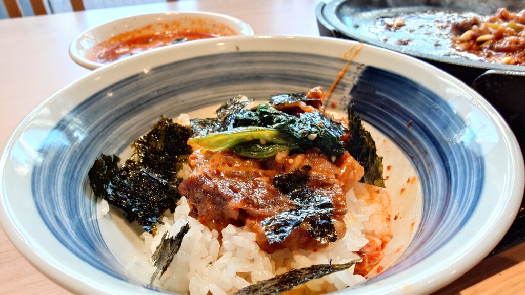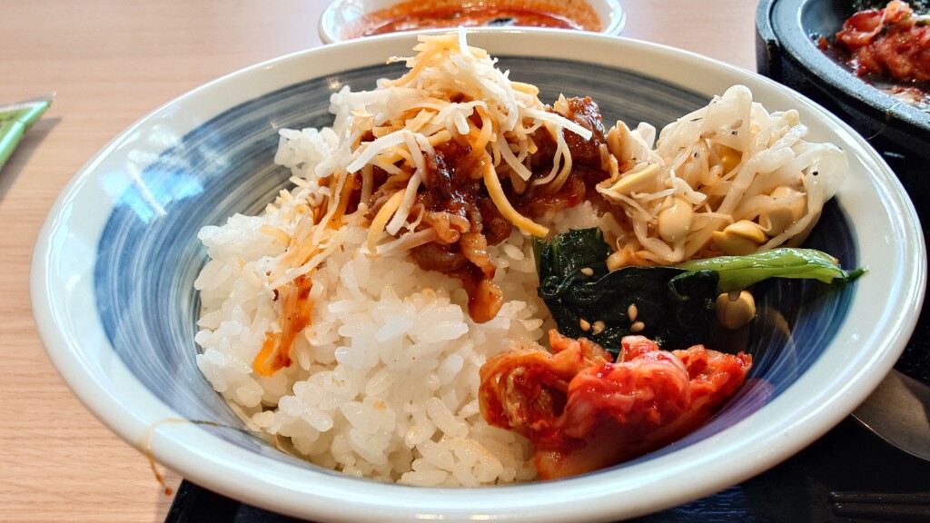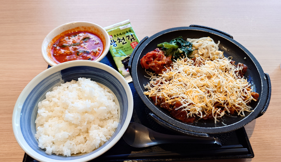 ご飯にナムルら、そしてスープが付いた定食としても味わう事が可能