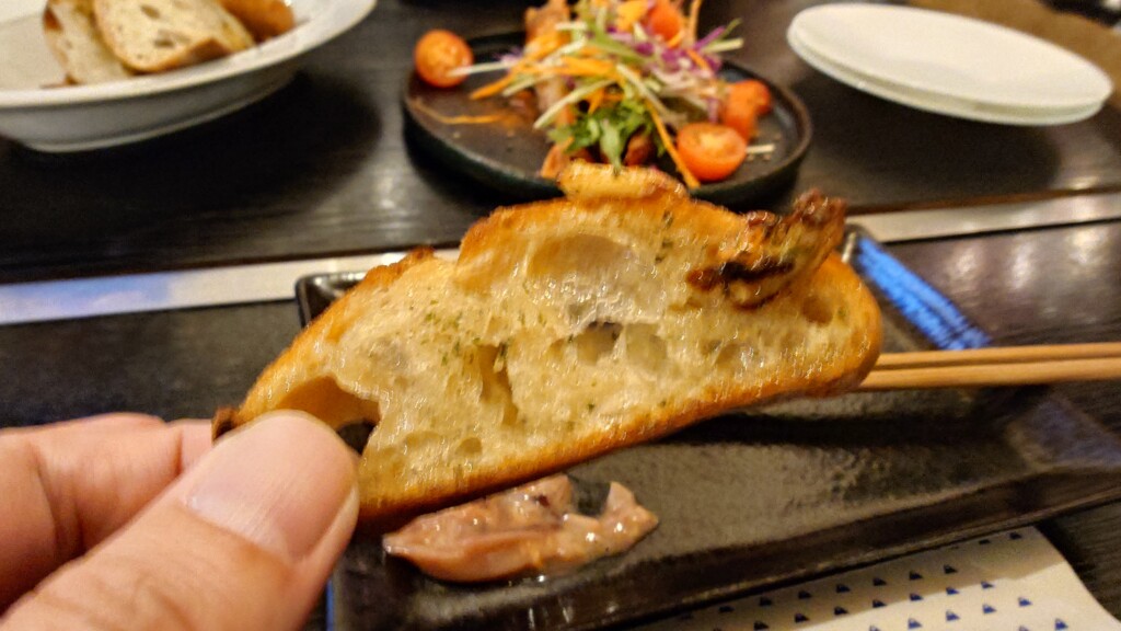 荒々しいバゲットと共に、たっぷり盛られたガーリックスライス