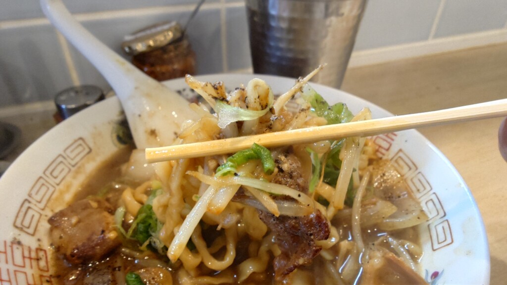 火入れされたモツらの香ばしさも合わさり、ヘビーなだけでは留まらない旨味も広がるスープに