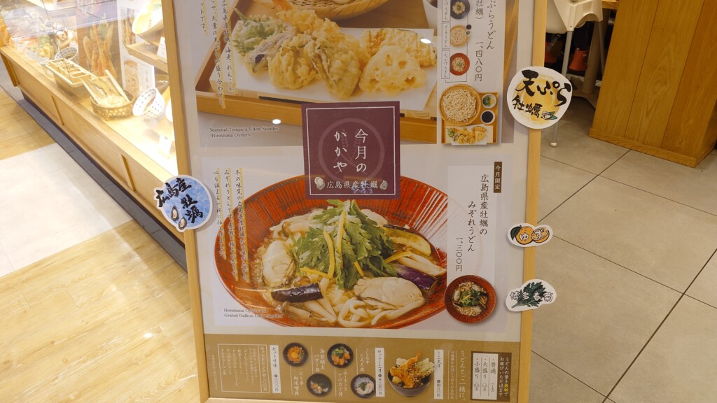 冬らしい広島の牡蠣をメインにした、みぞれうどんや天ぷらうどんが今月の限定メニューだそうで
