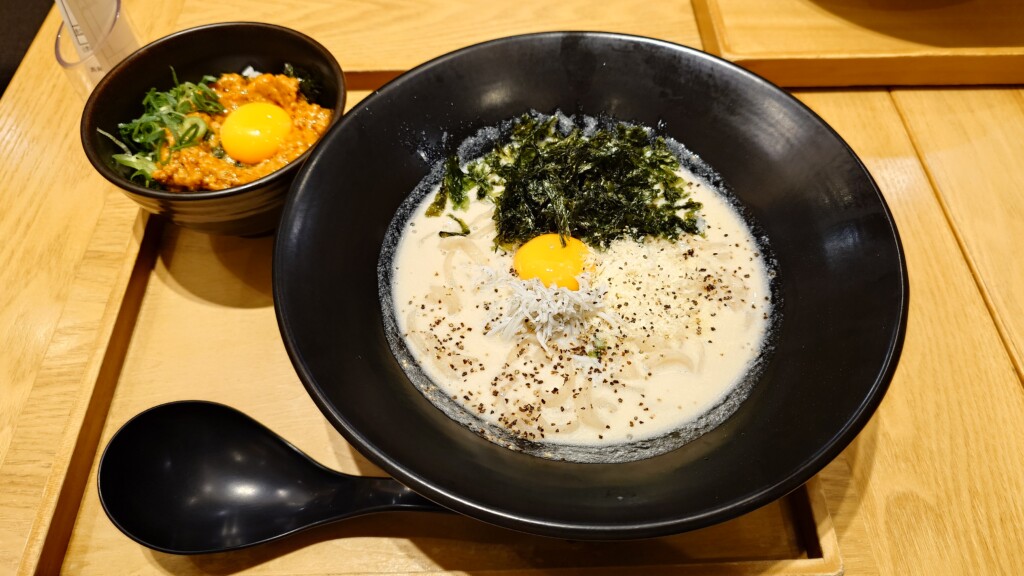 海苔ぼなーらクリームうどんとピリ辛肉味噌丼のセットとなります