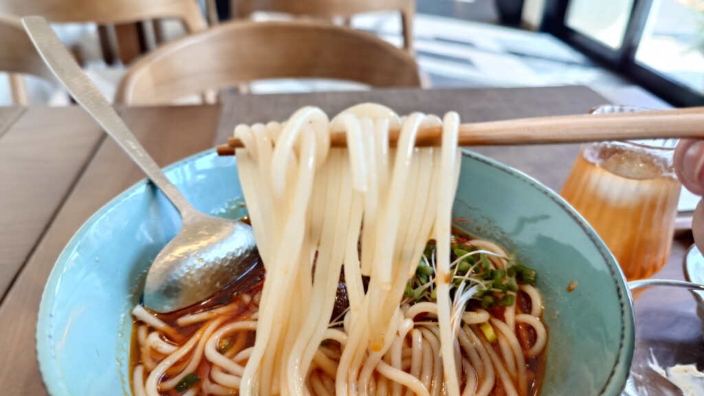 ただでさえ食感の良い丸麺が、一層のツルツルした舌触りでスープを楽しませてくれる麺に