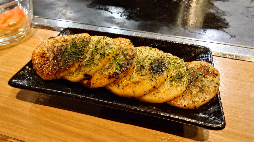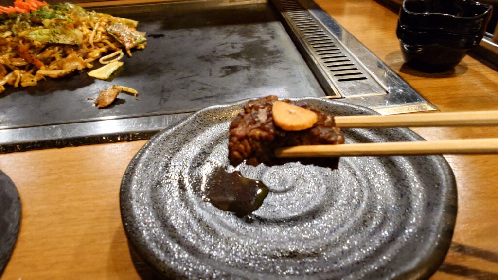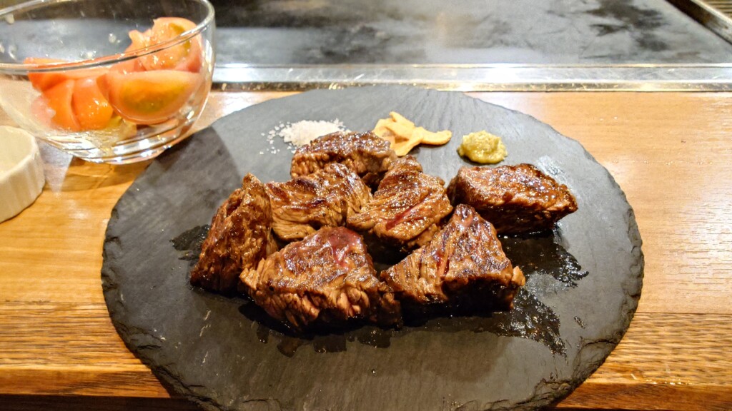 鉄板で焼かれひとくちカットの品となりますが、塩に山葵、フライドガーリックもセット