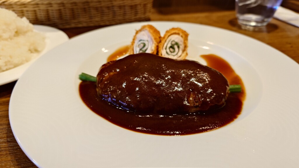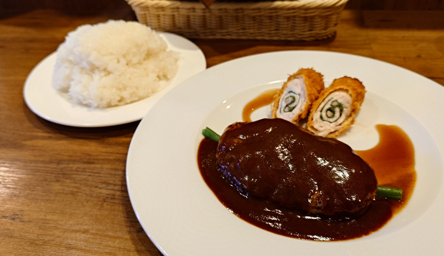 コク深いデミソースで頂く和牛ハンバーグにしそ巻きカツも味わう、大満足の日替わりランチ