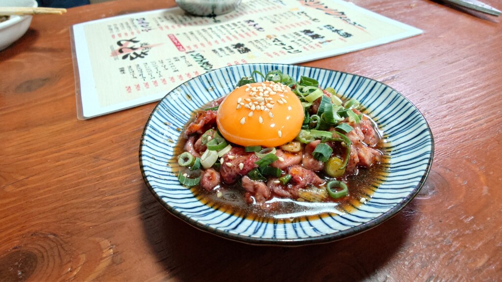 ユッケの様に、タレ&卵黄に絡め頂く同品ですが