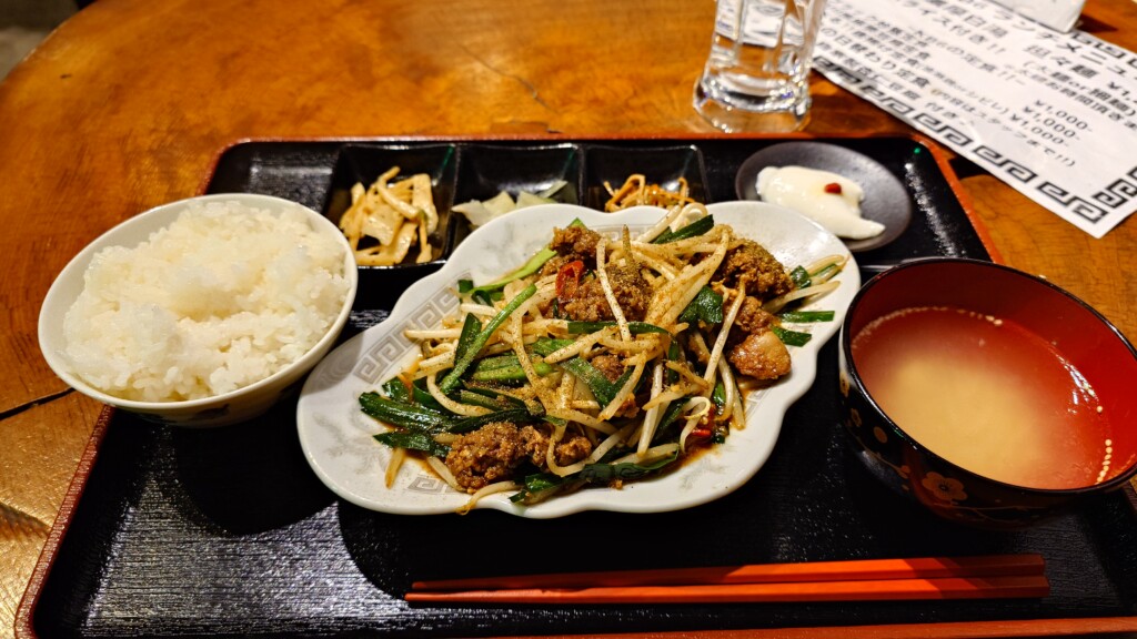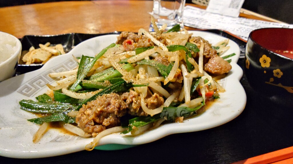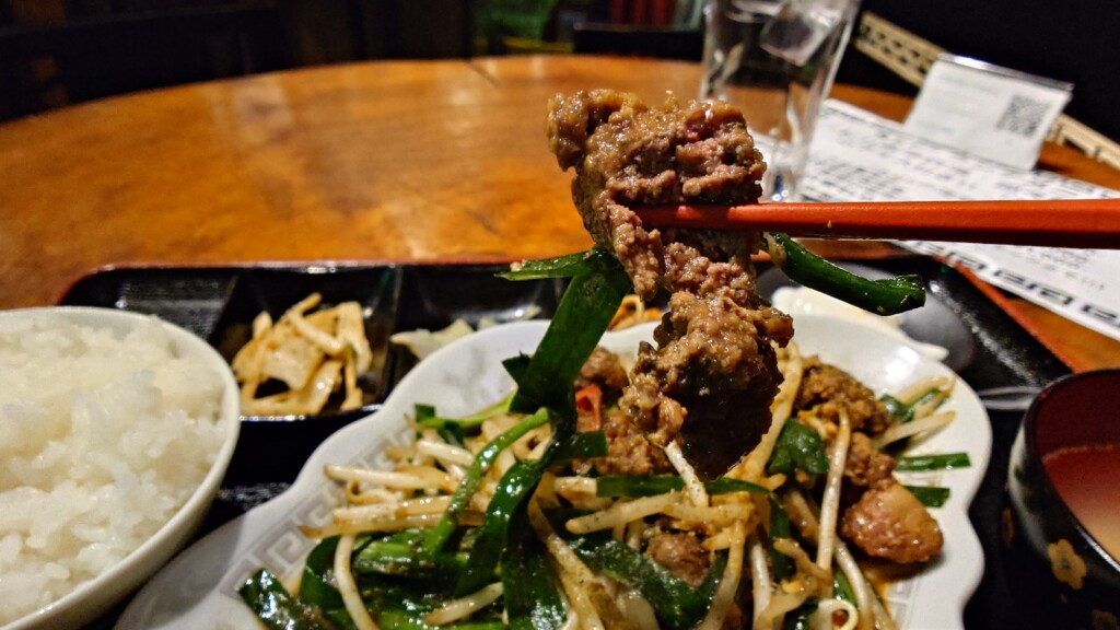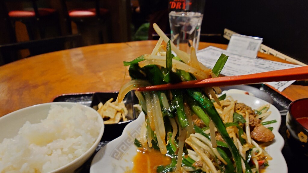 共に味わうもやし、そしれニラもまた濃い目の味付けが最高