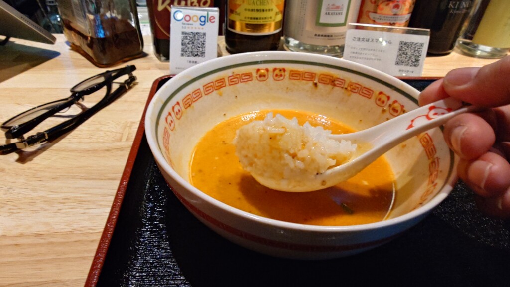 濃厚白湯&シビレもMAXを迎えるスープへ、ご飯をディップしながら堪能