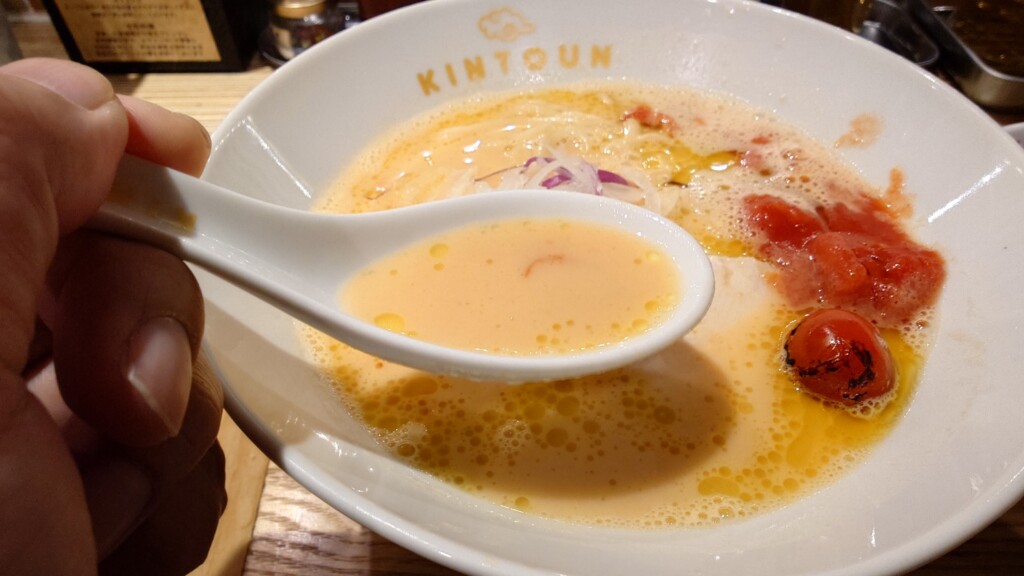酸味と甘み広がるトマトクリームスープ 追いトマトも味わい尽くす、トマトクリームらーめん