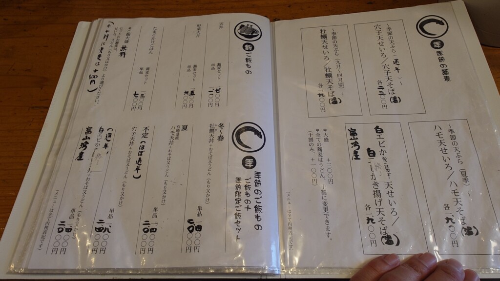 天丼に野菜天丼といった通年で提供されるものから、牡蠣天にはも天丼といった季節メニューも複数
