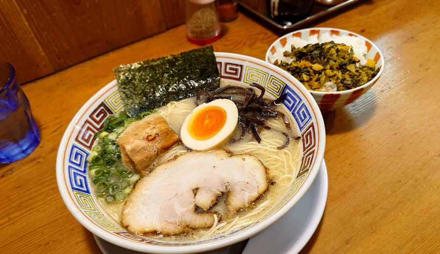 千葉でも指折りとなる九州豚骨が味わえる同店にて、今回はダブル幸福ラーメン&高菜ご飯を頂くことに